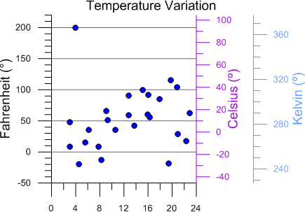 軸のリンク機能を使えば、ある軸に加えた制御内容を別の軸にも反映させることができます。制御軸に制御を加えれば、それに従属する軸の尺度、位置、目盛り間隔、上下両限界、および、長さを変化させることができます。位置情報にはオフセット値を含めることができますので、制御軸と従属軸の間を常に一定のページ単位数だけ空けるように設定することができます。従属軸が常に制御軸の長さの一定の割合になるよう長さには乗数を含めることができます。また、複数の単位を同一のグラフ上で表示できるよう、任意の数学関数をベースにして上下両限界を指定することができます。この機能が装備されたことで前よりもずっと簡単にグラフを編集することができます!