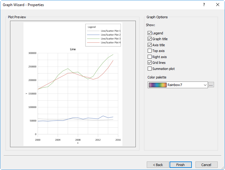 単一または複数のプロットの構成もデフォルトで充分に満足のいくグラフとして素早く簡単に作成することができます。Grapher の熟練ユーザーか初めてのユーザーかにかかわらず、新たに改良された Graph Wizard を使えば、目的のファイルをデータのプレビューを通じて選択したり、データとして使用する部分をカスタマイズしながら目的のプロットを選択したり、あるいは、選択肢として用意されているすべてのオプションの中から、視覚効果に関係するプロパティのみを迷わずに選択することができます。