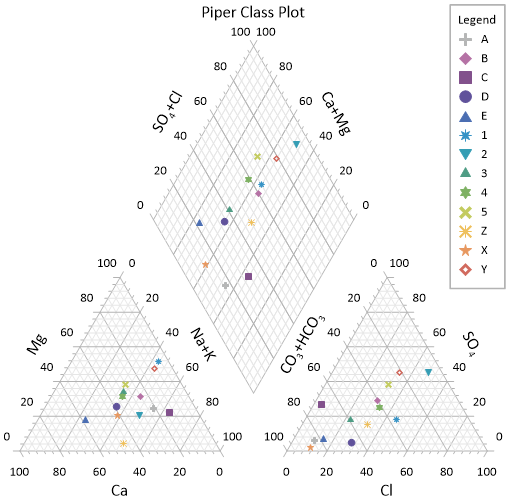 岩石、土壌、水化学のデータは、カスタマイズ自在で、操作性の高い、プロフェッショナル仕様の新しいグラフタイプで表示させることができます!シンボルなどの表示項目に変更を加えると、それに関連するすべてのプロットにその更新内容が反映されます。お持ちのデータは、そのままのシンプルな Piper プロットで表示したり、データをグループ分けして複合的に表示させることができます。