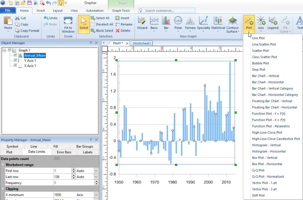 Add to Graph | Plot コマンドを使えば、作成したグラフにすばやく簡単に、別のプロットを追加することができます。対象とするプロットを選択した状態で、リボンバーの Home タブまたは Graph Tools タブからこのコマンドをクリックすると、選択したプロットに追加できるプロットタイプのリストが全て表示されます。