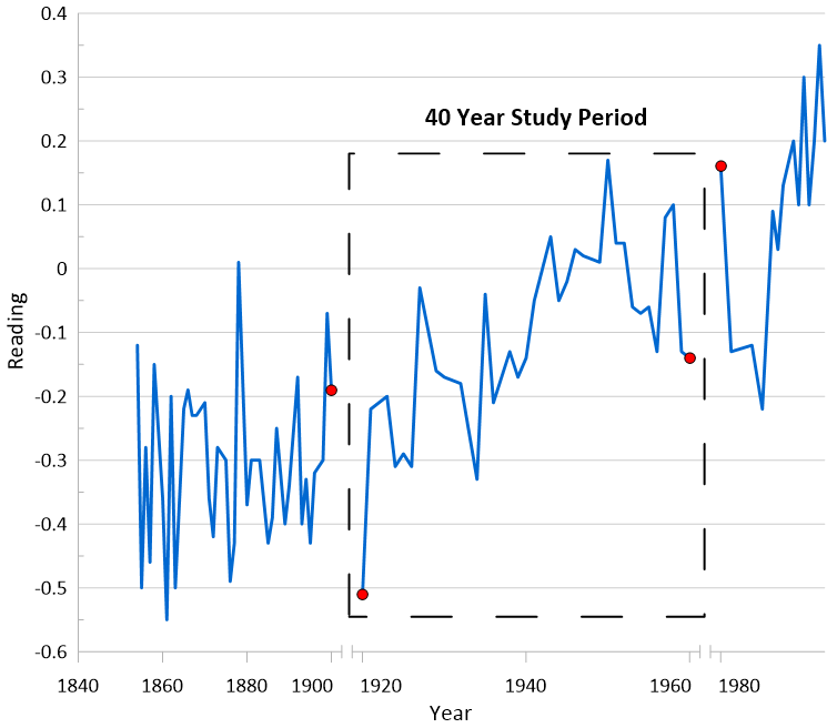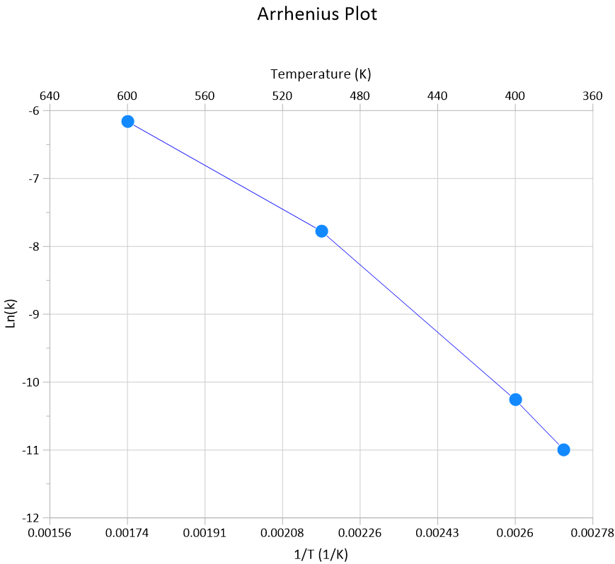 Grapher の新しい Inverse Linked Axis 機能を使用した例。 温度 (K) は、Linked X Axis に温度の逆数を指定した式 (1/T) を使用してプロットされます。