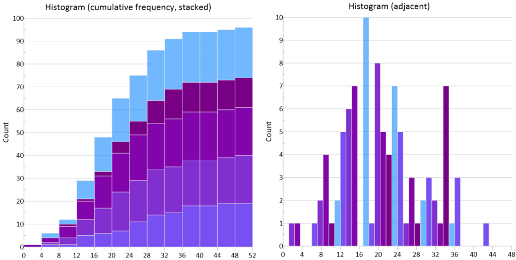 5つのヒストグラムのセットに対して、新しい Stacked および Adjacent コントロールを使用した例