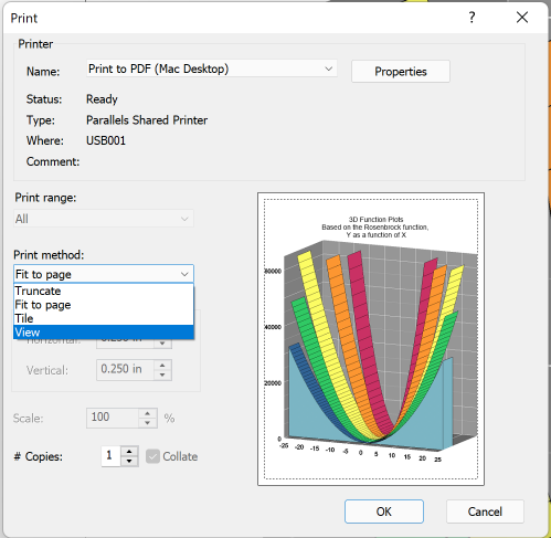 また、プリントプレビューも利用できるようになりました。これから印刷する内容を印刷する前に正確に確認できます!Print ダイアログの Print method に新たに追加された View を使えば、画面に表示されたものだけを印刷することができます。プロットの一部をズームインして印刷したい場合に便利なオプションです。