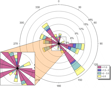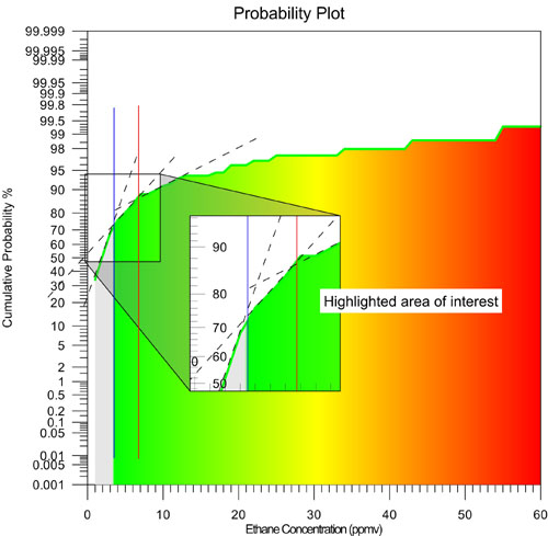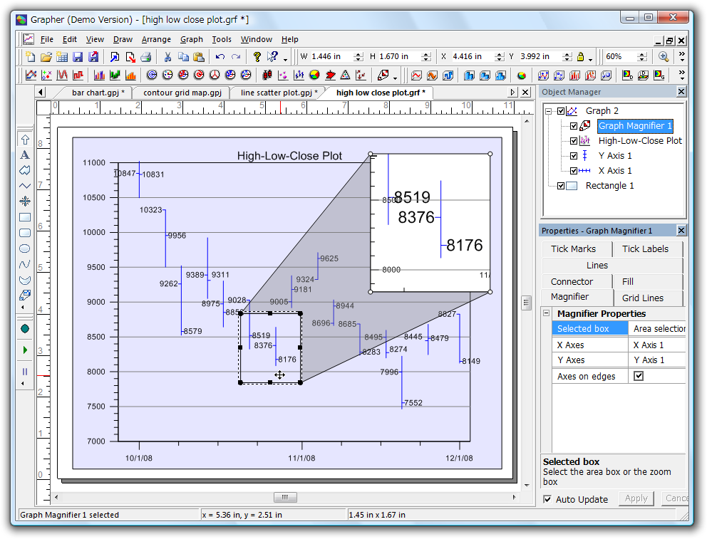 拡大鏡は、グラフの一部を拡大して表示させることができます。グラフ拡大鏡内の軸は、元のグラフとは独立してコントロールすることができます。拡大鏡はグラフ内あるいは印刷ページ内のどこにでも移動させることができます。
