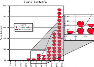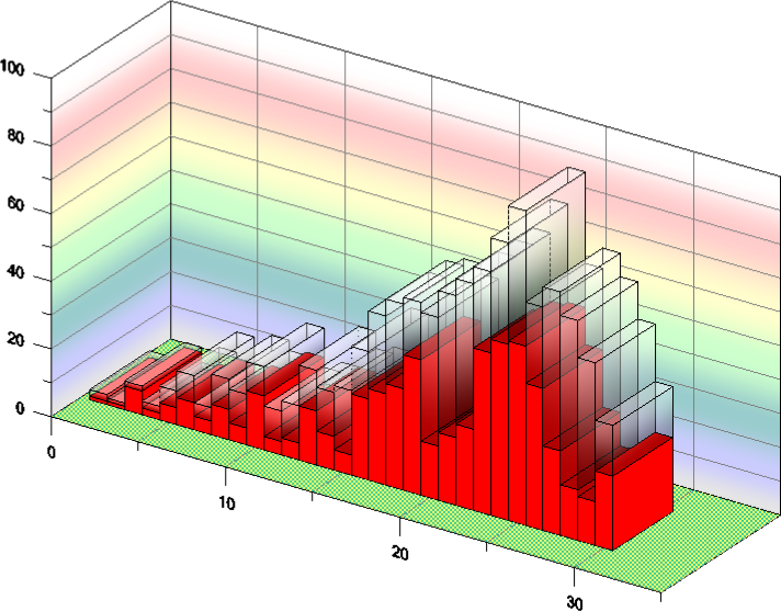 Grapher 8 は、棒グラフを通常の棒を使ってだけではなく、スピンドルや円錐形、ダイヤモンド形、あるいは自作の図形を使って表示することができます。棒の代わりに表示する図形の数、またはフルサイズで表示するかの設定ができます。