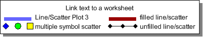 Grapher 8 では、凡例の機能が大幅に強化されました。ワークシートセルとのリンクが可能です。ラベルの位置を左右どちらか選べます。複数列表示ができ、タイトル、行、列の位置の調節が可能です。また曲線下の塗りつぶしが可能です。