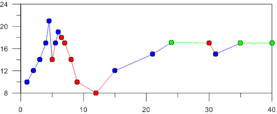 グラフの特定の範囲を強調するために、色を変えたい場合があります。Grapher 8 では、これが簡単に行えます。色設定用の列をワークシートに追加すれば、この設定に基づいてシンボルと折れ線の色が付けられます。
