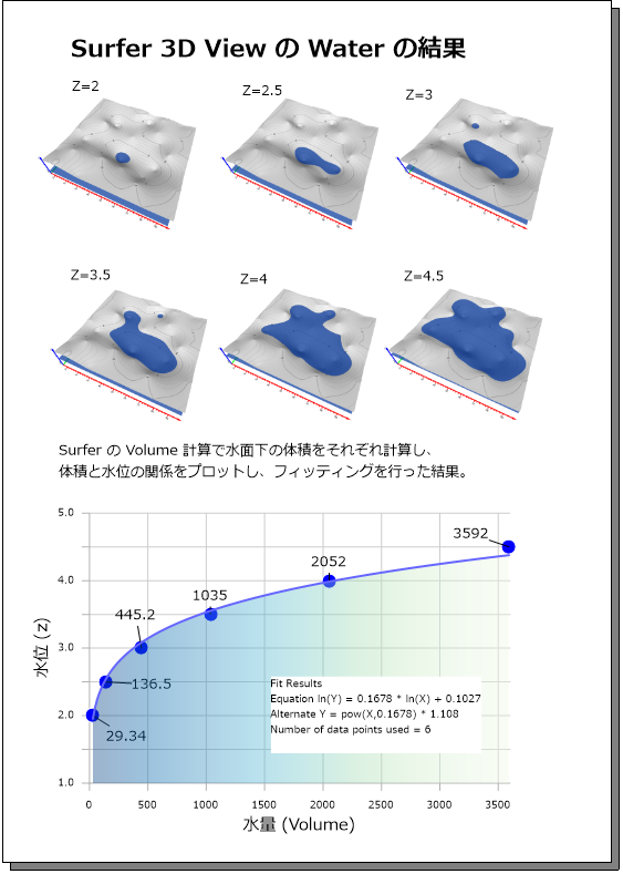 - Surfer の 3D View の Water という機能で、指定した Z 値に応じて 水面の位置を 3D モデル上で変化させ、各 z 値における Volume 計算結果とあわせて、水位の変化と面積や体積の変化をグラフィカルにまとめることができます。