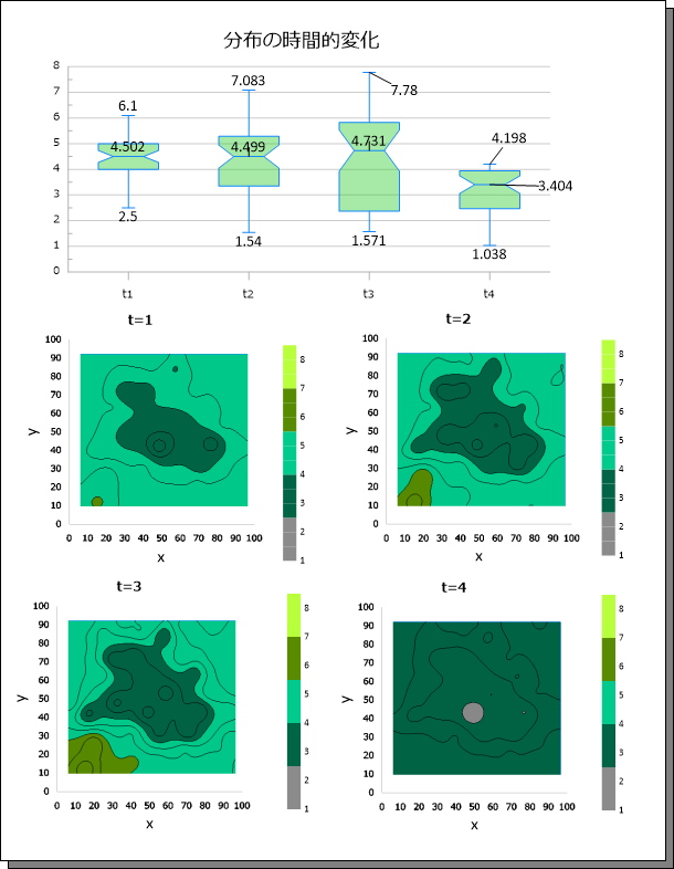 - 時間ごとの z 値の分布の違いと、対応する等高線図を Grapher でひとつのページにまとめたもの。等高線図は Grapher によるものですが (補間法:Inverse Distance)、Surfer で作成した kriging 法による補間結果を高解像度のイメージとしても配置できます。