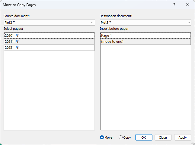 - Move or Copy コマンドを使えば、あるドキュメントに作成したページを異なるドキュメントのページとして移動・複製することも可能です。