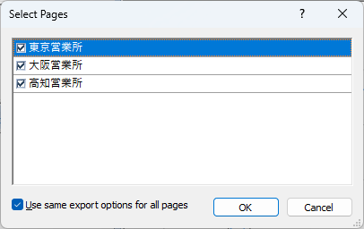 - Use same export options for all pages チェックでは、すべてのページに同じエクスポート オプションを使用するかどうかを選択します。このボックスをオンにすると、Export Options ダイアログが 1 つだけ表示されます。このボックスをオフにすると、エクスポートごとに 1 つの Export Options ダイアログが表示されます。