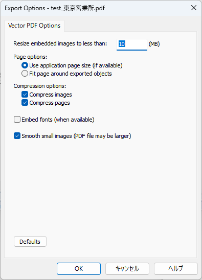 - ファイルの種類」に PDF (Vector) を選択し、ファイル名を指定して 「保存」ボタンをクリックします。
