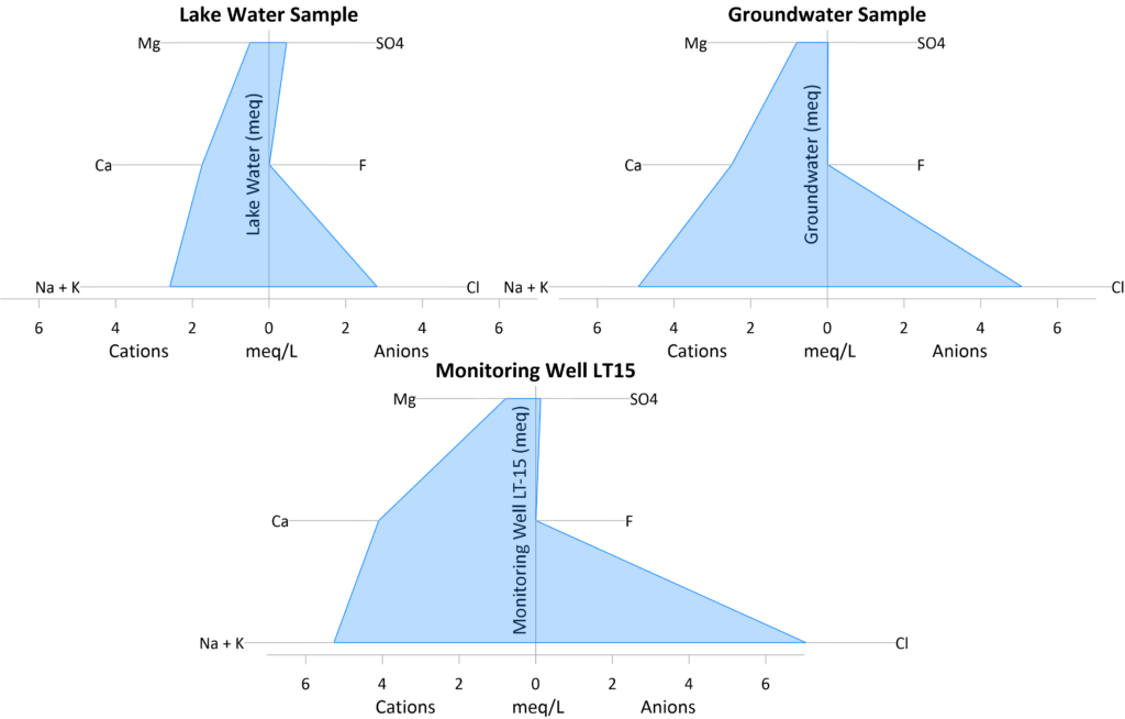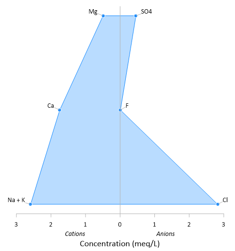 水サンプルの陽イオンと陰イオンの値は、1 リットルあたりのミリ当量で記録およびプロットされます。ダイアグラムの左側は陽イオン濃度を示し、右側は陰イオン濃度を示します。X 軸に沿って中心から遠い点ほど、イオン濃度が大きくなります。