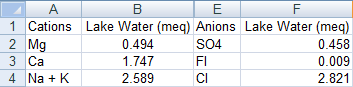 使用するデータは、陽イオンと陰イオンを別々の列に、それぞれの値を別々の行に配置する必要があります。以下のサンプル データは、stiff data.xls という名前のサンプル ファイルにあります。