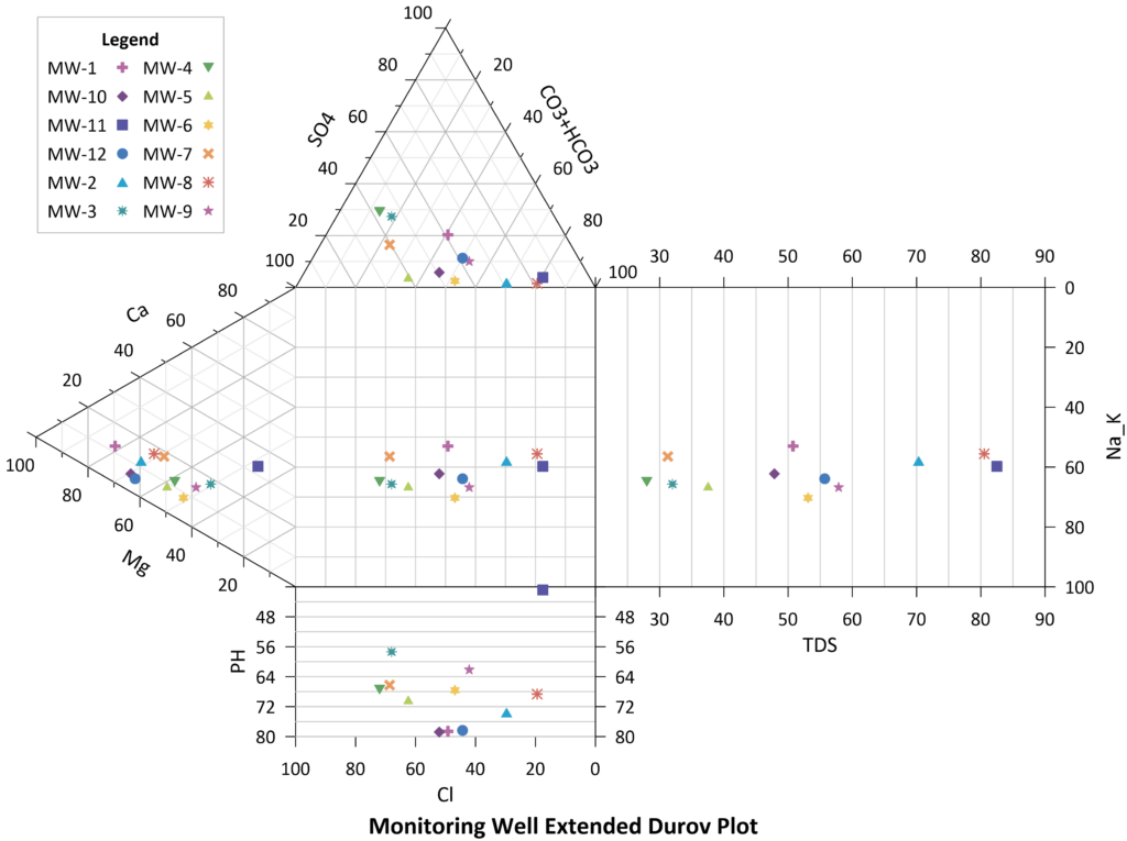 また、下側に pH プロット、右側に TDS (総溶解固形物) プロットを加えた拡張ドゥーロフダイアグラム (Extended Durov diagram) を使用して、サンプル間のさらなる地球化学的比較を行うこともできます。