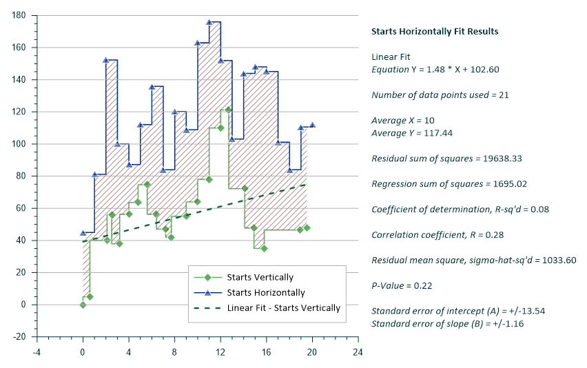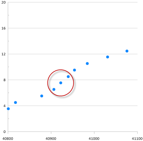 たとえば、以下の赤で囲まれた領域に方程式の範囲を制限する場合は、Minimum X plot value to fit に 40900 を入力し、Maximum X plot value to fit に 40945 を入力します。