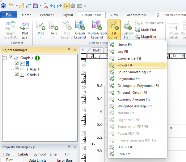 Object Manager で曲線を選択し、Property Manager でそのパラメーター (Fit type や Plot Interval など) を編集することで、当てはめ曲線のあらゆる側面を編集できます。当てはめ曲線の編集の詳細については、こちらを参照してください: Grapher Fit Curves Training Video