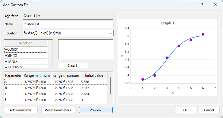 - Add Custom Fit ダイアログで、カスタムの当てはめ式とパラメータを指定して OK をクリックします。
