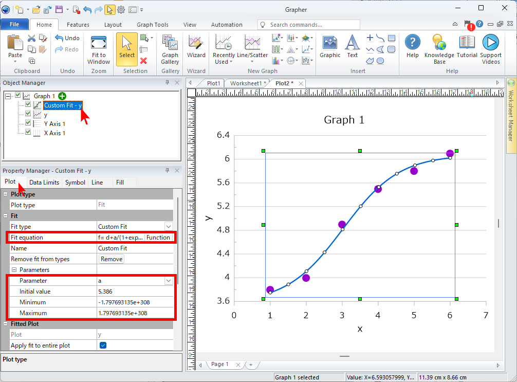 当てはめ曲線を編集するには、Object Manager で Fit curve を選択したあと、Property Manager の Plot タブで Fit equation と Parameters を編集します。