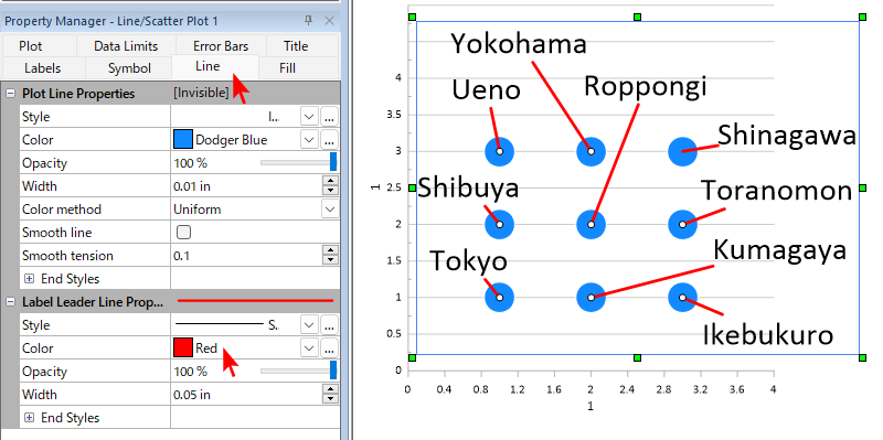 - Object Manager でラベルを移動するプロット、軸、凡例、またはグラフをクリックします。