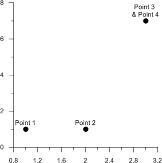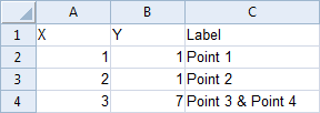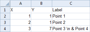 X、Y、ラベル列を持つ同じサンプル データ。3つ目のラベルには、改行を示す \n 指定子が付いています。