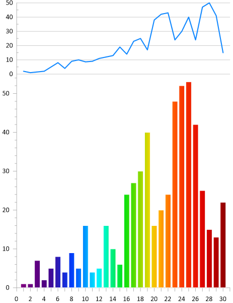 - None:X 軸とリンク設定しているのがもうひとつの X 軸の場合のみ選択可能です。いずれの軸も同じ場所から開始しますので、2つの軸は重なり合います。