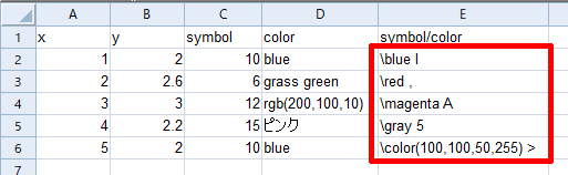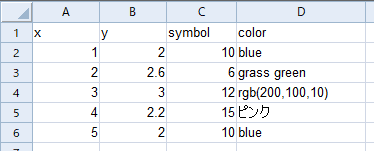 まず、データ変数とは別に、お使いのワークシートにシンボル用の列/行と、カラー用の列/行を用意します。シンボル用の列/行には、目的とするシンボルに関連付けられた数値インデックスを入力します。カラー用の列には、Grapher で定義済みのカラーのいずれかを入力します。