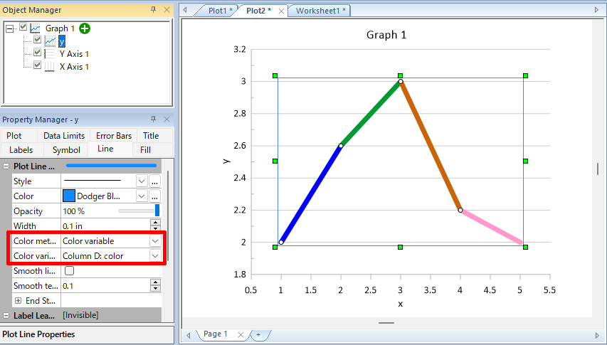 プロットの内容が Line である場合は、Property Manager の Line ページで、Color method を Color variable に変更し、目的のカラー情報を含むワークシートの列または行を選択します。