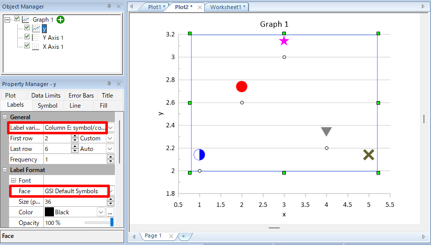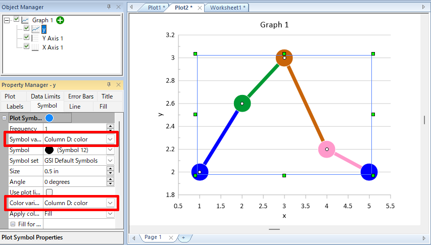 Grapher の Line/Scatter プロットの個々の点に特定のシンボルとカラーを定義するには2つの方法があります。シンボルをあらわす番号とカラーの定義は、ワークシート内の個別の列または行でおこないます。共有される単一の列または行からシンボルとカラーを定義することも可能です。