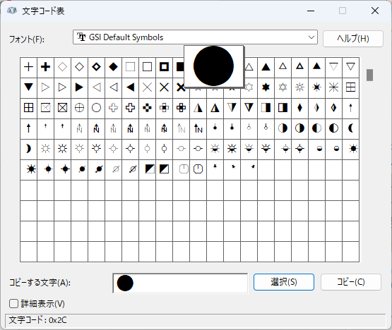 次に、カラー情報と同じセルにスペースを挟んでシンボルキャラクタを追加します。シンボルとして使用できるキャラクタを確認するには、Windows の文字コード表を使用します。