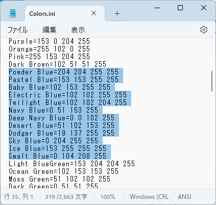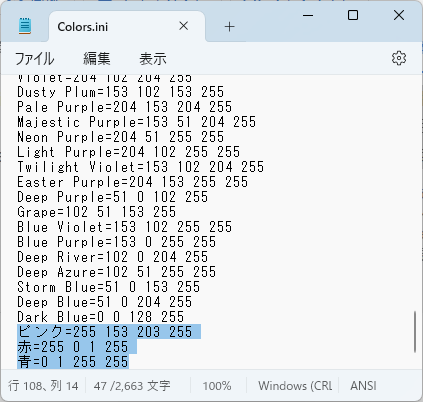 - Colors.ini ファイルをメモ帳などのテキストエディタで開きます。