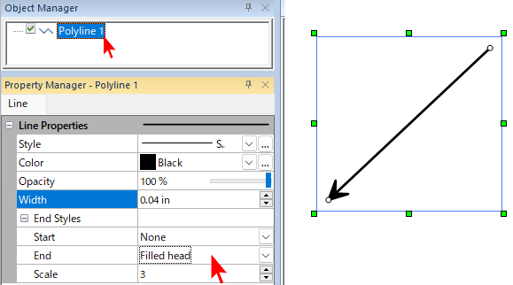 - Property Manager の End Styles で、Start または End オプションの None を目的とする矢印スタイルに変更します。