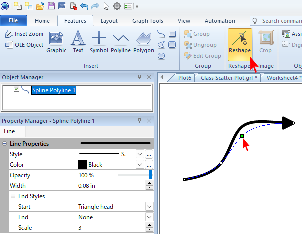 矢印を描画した後、矢印をクリックして選択し、プロパティ マネージャーで線の色、太さ、またはスタイルを変更できます。また、Insert | Reshape コマンドをクリックして、線上の任意のノードの位置を変更することもできます。