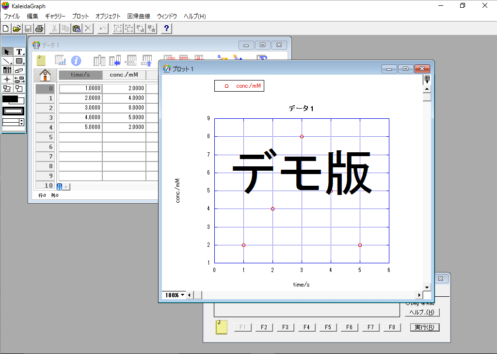 - ファイル>開く…から先ほど作成した Excel ファイルを KaleidaGraph に取り込みます。