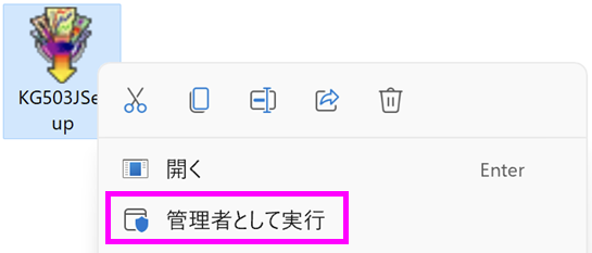 5. アイコンを右クリックしてメニューから管理者として実行を選択して実行します。