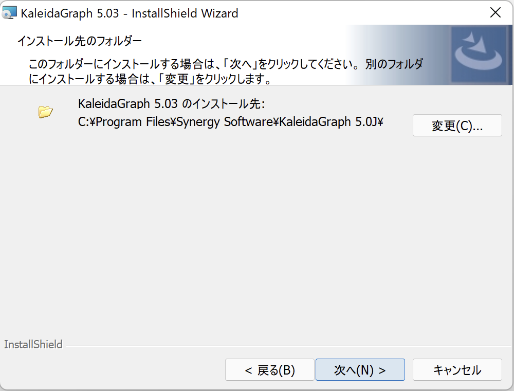 9. KaleidaGraph のインストール先を確認します。必要に応じてインストール先を変更することができます。次へをクリックします。