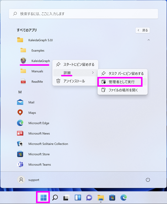 13. Windows メニューを選択し、すべてのアプリを選択し、KaleidaGraph アイコンを右クリックして管理者として実行を選択して KaleidaGraph を起動します。