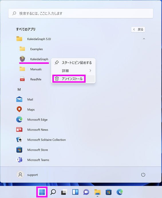1. Windows メニューから KaleidaGraph アイコンを選択して右クリックし、メニューからアンインストールを実行します。