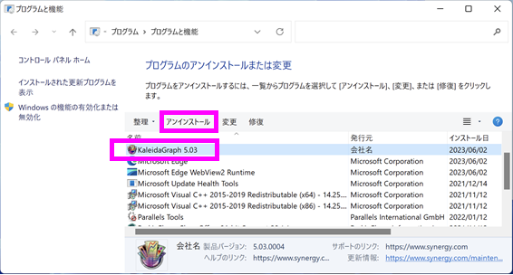 2. プログラムと機能画面が表示されます。リストから KaleidaGraph 5.0x を選択してアンインストールを実行します。