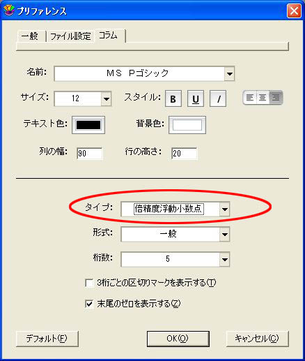 - 「ファイル」メニュー→「プリファレンス」→「コラム」タブでデータ形式を「倍精度浮動小数点」に選択してからテキストファイルを読み込み、「整数」に変更します。(※ カレイダグラフ 4.0 の場合)