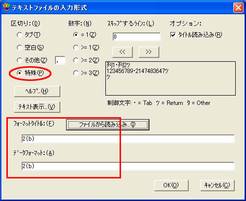 - テキストファイルを読み込んだ際の「テキストファイルの入力形式」ダイアログで「特殊」にチェックしてデータフォーマット欄に「b b」や「2(b)」 (※読み込む列数が 2 列の場合) を入力して倍精度で読み込んで下さい。