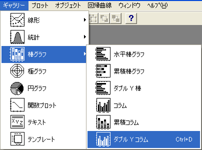 - データを元に棒グラフを作成します。棒グラフの種類はいずれでも構いませんが、この場合は、メニューバーの「ギャラリー」から 棒グラフ > ダブル Y コラム を選択します。