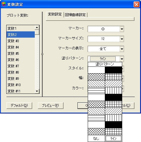 - 変数設定ダイアログが現れますので、変数の一方の塗りパターンを「ライン」に変更します。この場合は、「変数2」の塗りパターンをラインに変更してみます。
