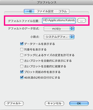 ファイルメニュー → プリファレンス → 一般 → デフォルトファイル位置 でパスを指定すると、ファイルを開いたり保存したりするときのデフォルトパスを指定できますが、デフォルトの位置を指定後 KaleidaGraph を終了/再起動しただけでは、設定が元に戻ってしまいます。