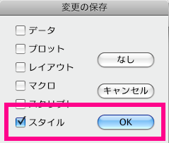 KaleidaGraph を終了するときに表示される「変更の保存」ダイアログで「スタイル」にチェックを入れ、スタイル初期設定ファイルに保存することで、この設定を保持できます。