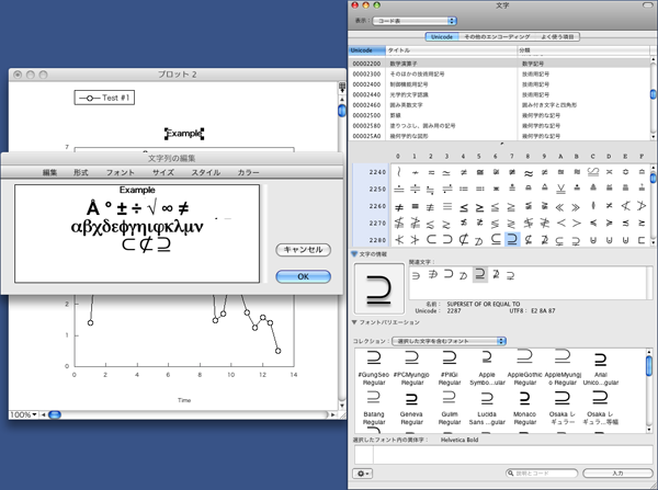 Mac OS X 版では、フォントを任意の英語フォントに選択後、文字パレットから文字を選択してご入力下さい。(表示できる特殊文字は限られます)