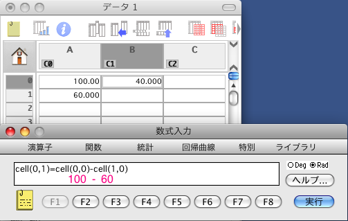 セル0行0列 (C0) の値からセル1行0列 (C0) の値を引き算した結果をセル0行1列 (C1) に表示します。