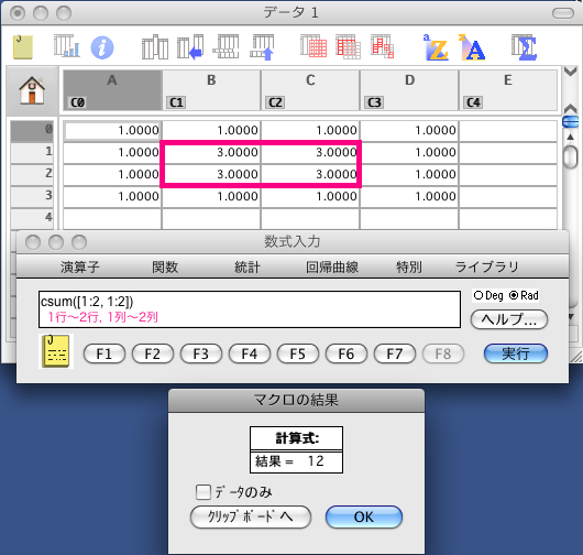 マトリクスを指定して合計する場合は、csum コマンドを利用して次のように入力します。
