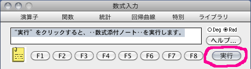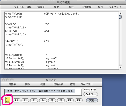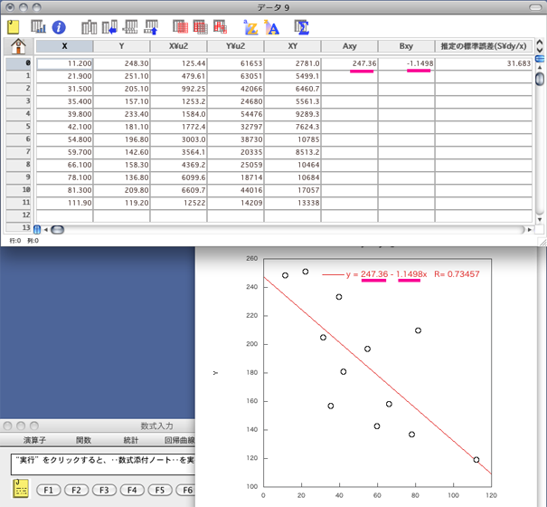 たとえば次の内容は、データシート上で線形回帰の回帰定数を計算し、グラフ表示までの処理を行います。