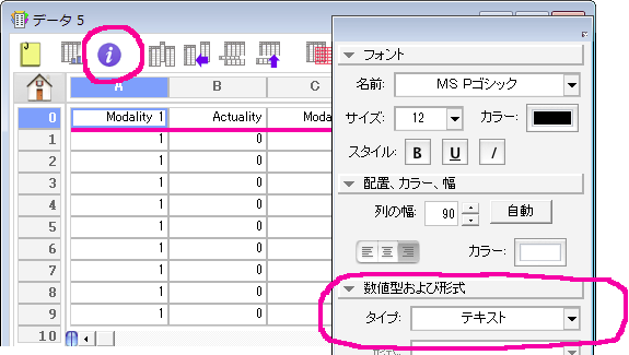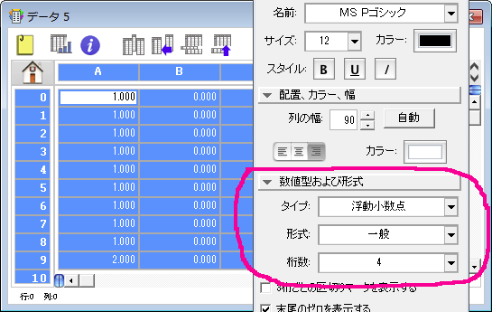 次の図は、Excel からコピー&ペーストでデータをコピーしたものですが、先頭行にテキストデータが入っているため、数値形式が「テキスト」になっています。